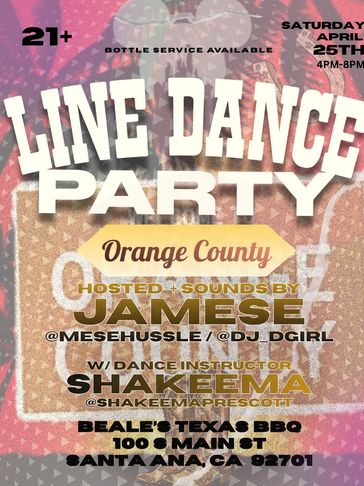 Line Dancing Party, April 25th from 4pm to 8pm. Bottle service Available. 21+